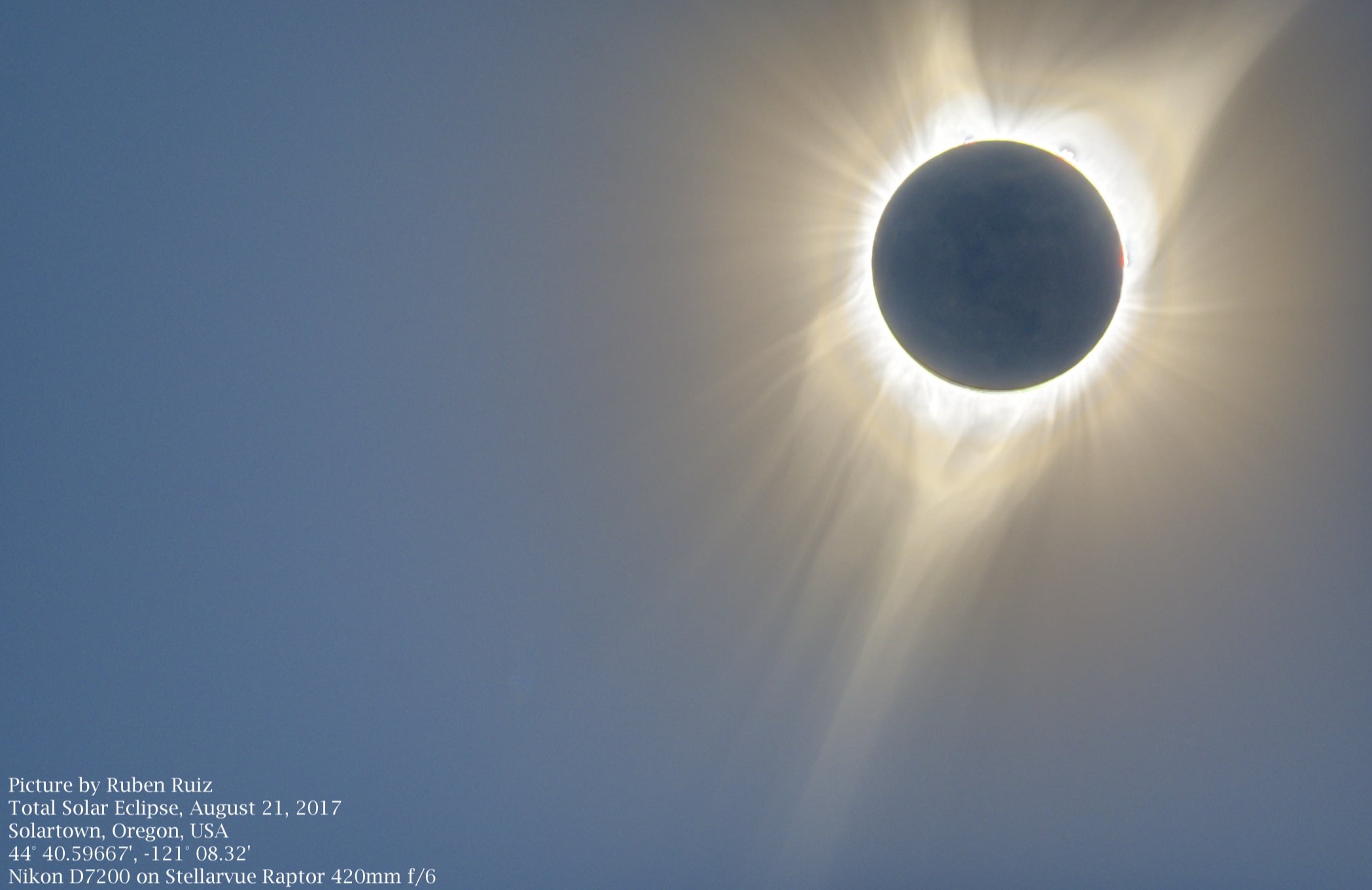 Un Eclipse Solar Total ocurre cuando la luna está entre la tierra y el sol, y además la luna está relativamente más cerca a la tierra, por lo tanto cubre por completo al sol. Durante las etapas parciales del eclipse se deben de utilizar filtros solares para verlo, pero durante la totalidad se deben de remover dichos filtros solares y observar el eclipse a simple vista.
