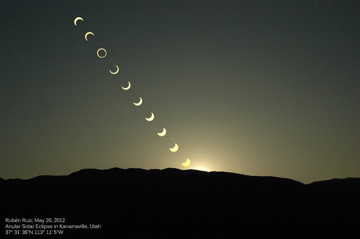 Un Eclipse Anular ocurre cuando la luna está un poco más alejada de la tierra, y por lo tanto se ve relativamente más pequeña que el sol. La luna estará justo frente al sol, y el sol se podrá ver como un anillo.