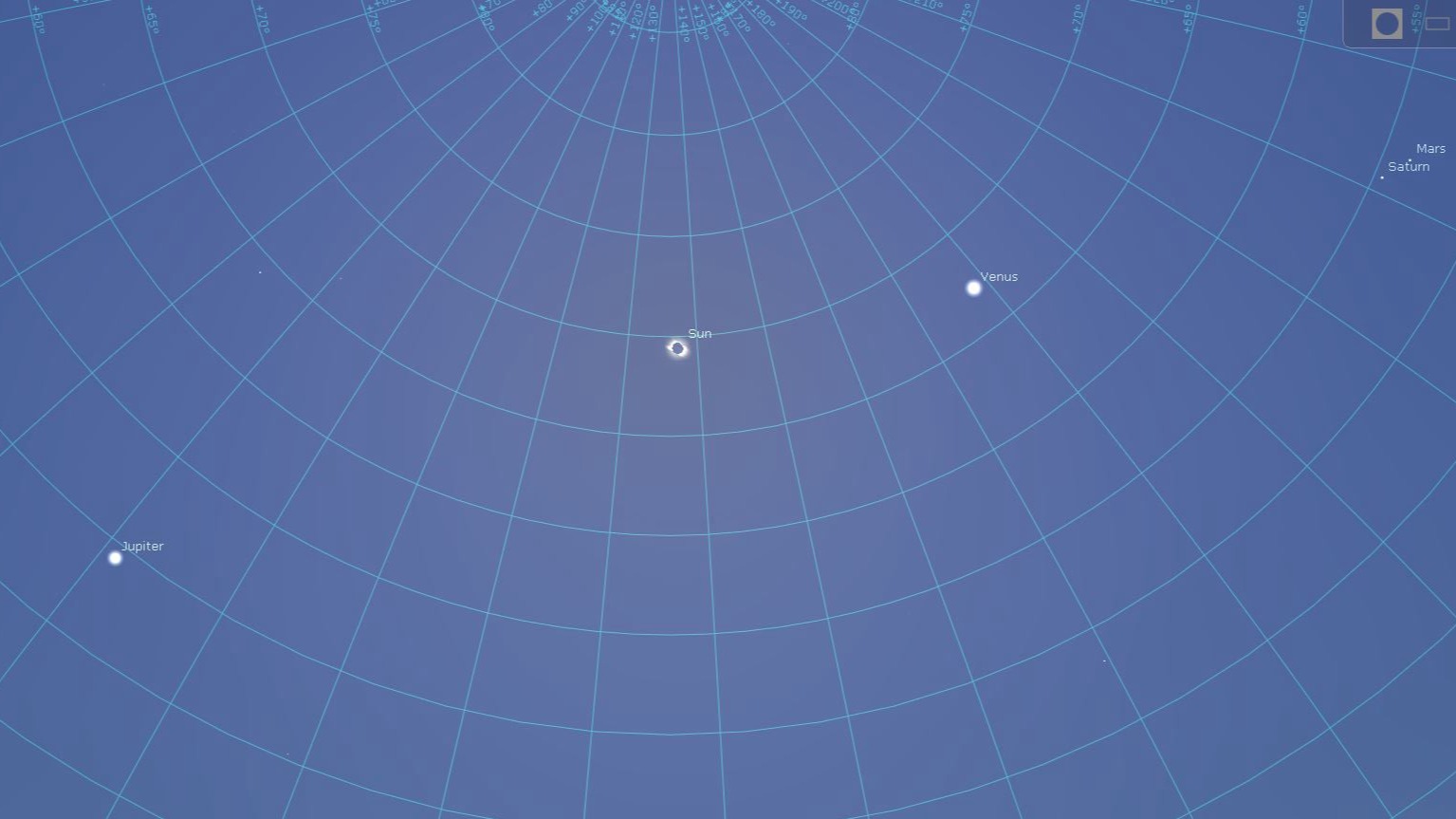 Cuando el sol se encuentre totalmente eclipsado, seguramente se podrán ver los planetas Venus y Júpiter. En esta imágen se podrás ver la ubicación de ambos planetas durante el ecilpse:
