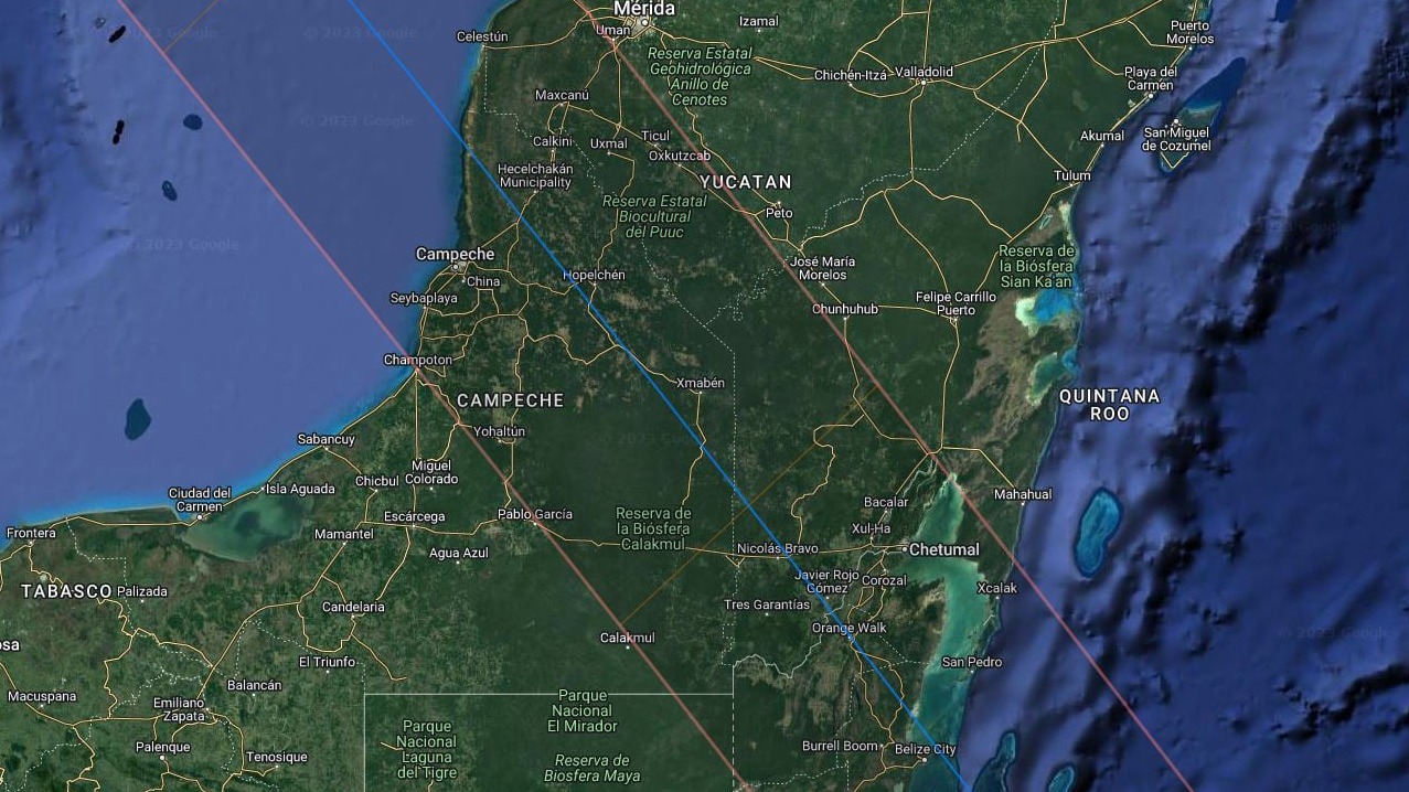 El eclipse será visible en el suréste de México. A continuación se encuentra una imágen más detallada de la trayectoria del Eclipse. La línea azul es el centro del Eclipse. En este lugar el eclipse durará más tiempo, y además la luna estará completamente centrada alrededor del sol. Las líneas rojas muestran los bordes del eclipse. Una vez fuera de las líneas rojas, el eclipse no se verá como anular sino solamente como eclipse parcial. Entre más cercano se encuentre el observador a la línea roja (dentro de la zona del eclipse) menor tiempo durará el eclipse y además la Luna no se mostrará completamente centrada frente al sol. La imágen es cortesía de Xavier Jubier.