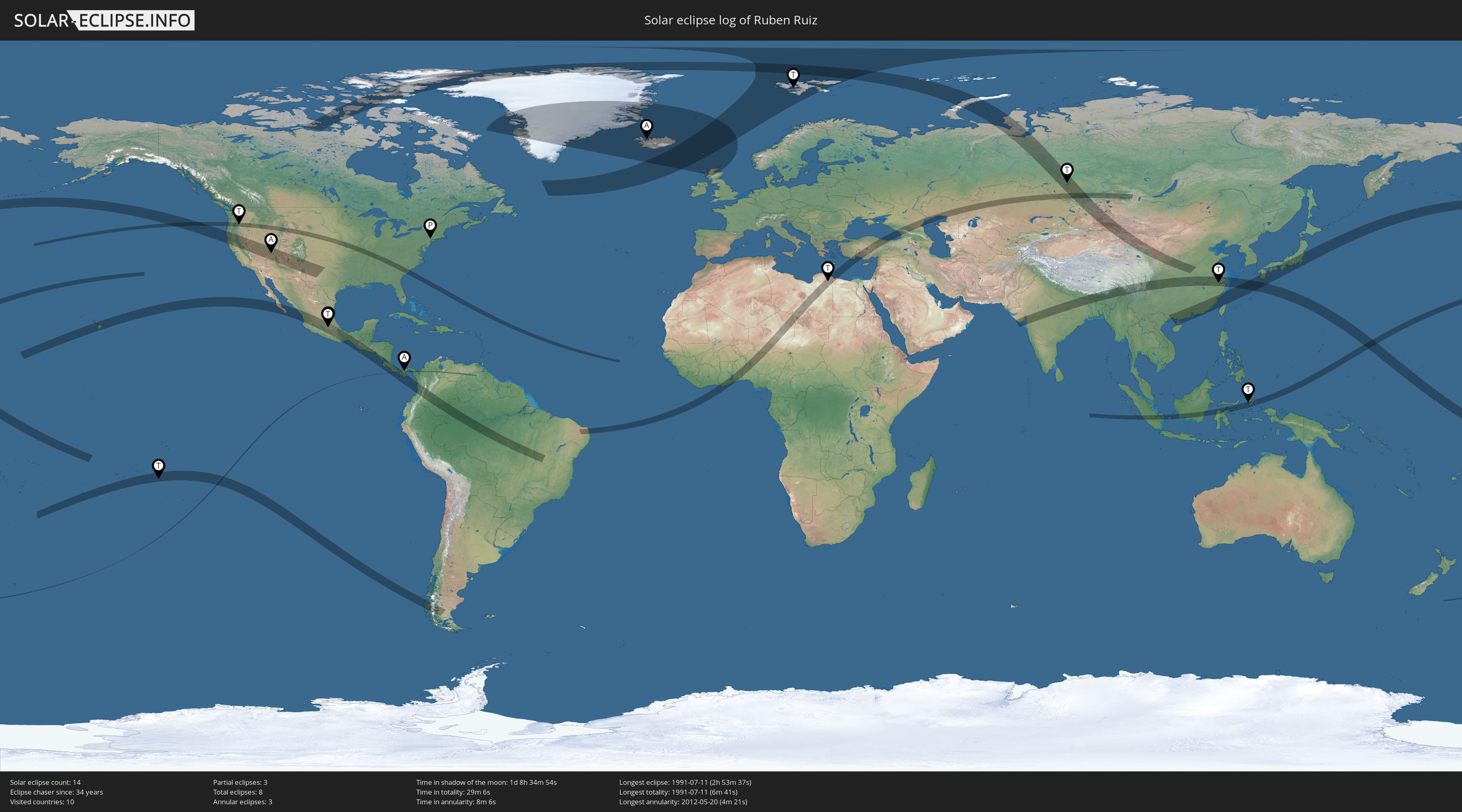 Here we, Eclipse Chasers, add the information about the Eclipses we have seen. It is normally sorted by count of Eclipses. At the moment I created this webpage, my count was 14, proudly being the Mexican that has seen more Solar Eclipses!